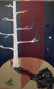 Mixed media — acrylic, oil, dried flowers, plants, sand, cotton fabric, golden nails, and red thread on canvas